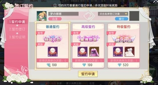 分為普通誓約、高級(jí)誓約、特級(jí)誓約,對(duì)應(yīng)價(jià)格為綁鉆199 、鉆石199 、鉆石520