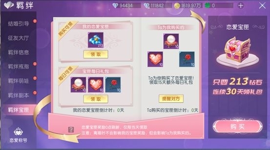 1. 購(gòu)買戀愛(ài)寶匣后,當(dāng)日即可領(lǐng)取213綁定鉆石