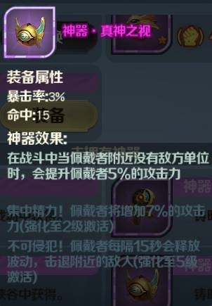 這個算是觸發效果最麻煩的一件神器啦,“戰斗附近沒有地方單位”,這就意味著不能被刺客型英雄近身,所以肯定是得給后排英雄才能將效果盡可能地發揮到最大了。這件神器本身具有強力的攻擊增幅,這么說的話可以適用于所有輸出C為的遠程英雄,不過她還有提升命中這一點結合之前種種讓我一瞬間覺得這神器就是給夏爾量身打造的。
