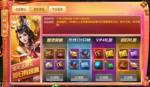 活動內(nèi)容:活動期間,100級以上達到要求的玩家均可領(lǐng)取周年禮包。