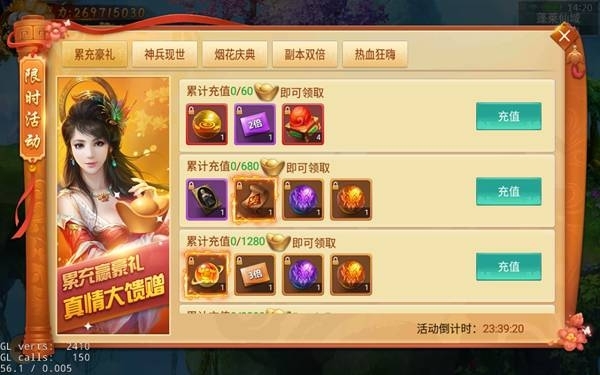 活動說明:累充送豪禮,真情大回饋,活動期間累計充值達到指定元寶,即可領取多倍經驗卡、翅膀潛能丹,極品時裝幻化等豐厚大禮!