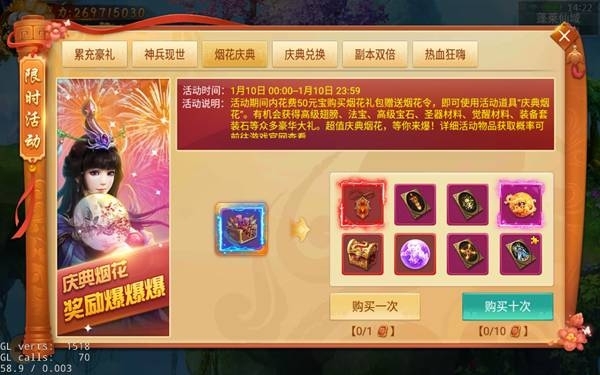 活動說明:活動期間內花費50元寶購買并使用活動道具“慶典煙花”,即有機會獲得高級翅膀、法寶、高級寶石、裝備套裝石等眾多豪華大禮。超值慶典煙花,等你來爆!