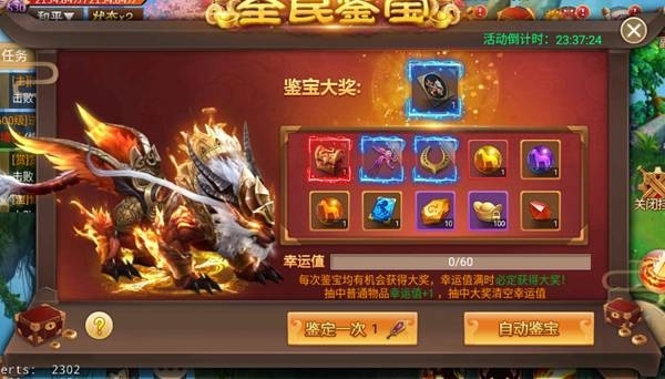 活動說明:活動期間,可以花費50元寶進行鑒寶,鑒寶一次增加一點幸運值,幸運值越高中獎幾率越高,幸運值滿必開大獎。大獎:珍貴坐騎-迅影灼獅