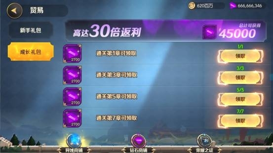 1、成長禮包,成長禮包的獎勵是超值的,普通充值的128元獲得的鉆石有2560鉆而且是在首充翻倍的情況下,而成長禮包有高達30倍的鉆石獎勵,總計45000鉆石比普通充值高出15倍!,并且成長禮包是根據玩家推圖進度開放獎勵的,這樣可以讓玩家有一個目標性,而不是盲目的充值消費。