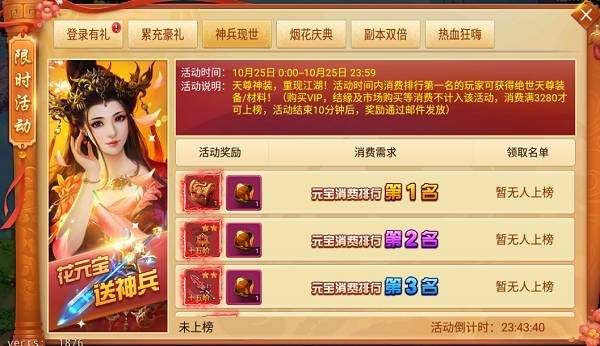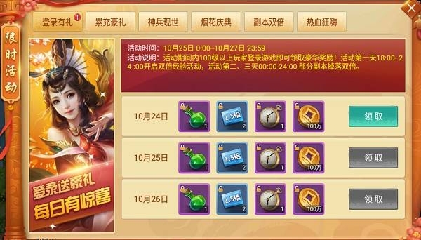 活動(dòng)說(shuō)明:登錄豪禮來(lái)相送,全民齊狂歡!活動(dòng)期間,100級(jí)以上的玩家登陸游戲即可領(lǐng)取登錄獎(jiǎng)勵(lì)!