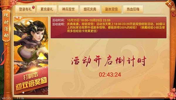 活動(dòng)說(shuō)明:活動(dòng)期間內(nèi),第一天經(jīng)驗(yàn)翻倍,第二、三天特定副本雙倍掉落,道具獎(jiǎng)勵(lì)超爽翻倍!