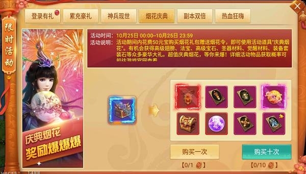活動(dòng)說(shuō)明:活動(dòng)期間內(nèi)花費(fèi)50元寶購(gòu)買并使用活動(dòng)道具“慶典煙花”,即有機(jī)會(huì)獲得高級(jí)翅膀、法寶、高級(jí)寶石、裝備套裝石等眾多豪華大禮。超值慶典煙花,等你來(lái)爆!