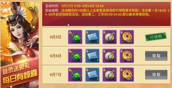 活動(dòng)說(shuō)明:登錄豪禮來(lái)相送,全民齊狂歡!活動(dòng)期間,100級(jí)以上的玩家登陸游戲即可領(lǐng)取登錄獎(jiǎng)勵(lì)!