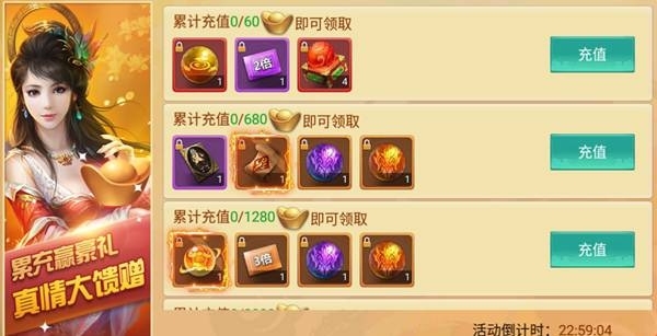 活動(dòng)說(shuō)明:累充送豪禮,真情大回饋,活動(dòng)期間累計(jì)充值達(dá)到指定元寶,即可領(lǐng)取多倍經(jīng)驗(yàn)卡、坐騎潛能丹,極品時(shí)裝幻化等豐厚大禮!