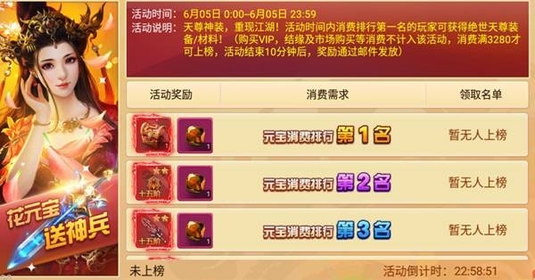 活動(dòng)說(shuō)明:天尊神裝,重現(xiàn)江湖!活動(dòng)時(shí)間內(nèi)消費(fèi)排行第一名的玩家可獲得天尊自選箱(唯一產(chǎn)出),第二名可獲得極品飾品,三四五名可獲得極品紅裝!(活動(dòng)結(jié)束后通過(guò)郵件發(fā)放)