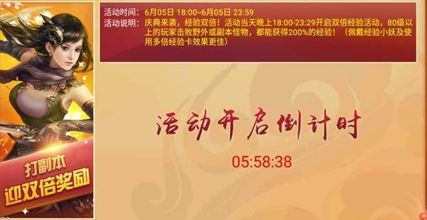 活動(dòng)說(shuō)明:活動(dòng)期間內(nèi),第一天經(jīng)驗(yàn)翻倍,第二、三天特定副本雙倍掉落,道具獎(jiǎng)勵(lì)超爽翻倍!