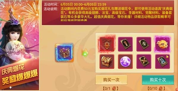 活動(dòng)說(shuō)明:活動(dòng)期間內(nèi)花費(fèi)50元寶購(gòu)買并使用活動(dòng)道具“慶典煙花”,即有機(jī)會(huì)獲得高級(jí)翅膀、法寶、高級(jí)寶石、裝備套裝石等眾多豪華大禮。超值慶典煙花,等你來(lái)爆!
