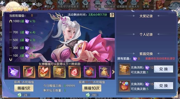 3.祝福值達到指定數值,可額外獲得【紫晶】,【紫晶】可用于兌換稀有獎勵