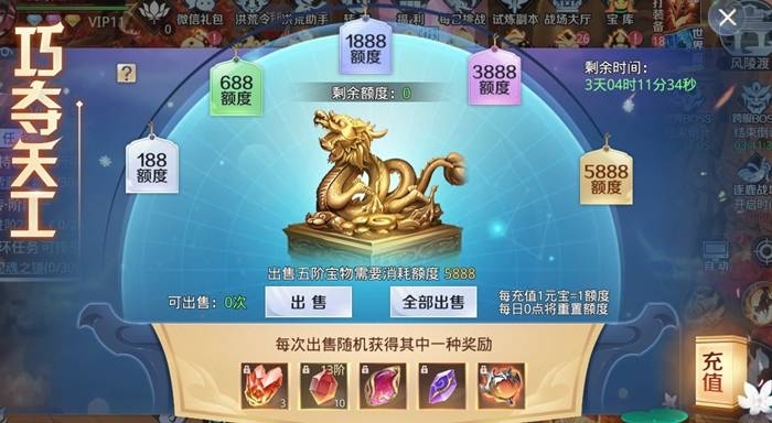 2. 活動界面上方有5個選項按鈕,分別代表5種寶物的價值,點擊按鈕可切換到想要的檔次,每出售1次消耗對應的額度