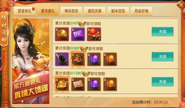 活動說明:累充送豪禮,真情大回饋,活動期間累計充值達到指定元寶,即可領取多倍經驗卡、翅膀潛能丹,極品時裝幻化等豐厚大禮!