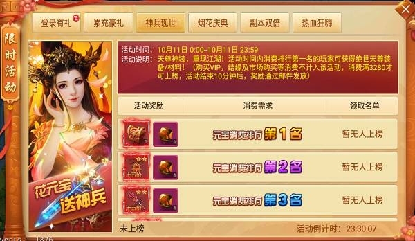 活動說明:天尊神裝,重現江湖!活動時間內消費排行第一名的玩家可獲得天尊自選箱(唯一產出),第二名可獲得極品飾品,三四五名可獲得極品紅裝!(活動結束后通過郵件發放)