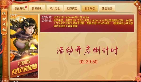 活動說明:活動期間內,第一天經驗翻倍,第二、三天特定副本雙倍掉落,道具獎勵超爽翻倍!
