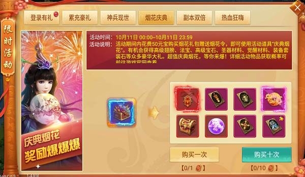 活動說明:活動期間內花費50元寶購買并使用活動道具“慶典煙花”,即有機會獲得高級翅膀、法寶、高級寶石、裝備套裝石等眾多豪華大禮。超值慶典煙花,等你來爆!