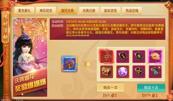 活動說明:活動期間內花費50元寶購買并使用活動道具“慶典煙花”,即有機會獲得高級翅膀、法寶、高級寶石、裝備套裝石等眾多豪華大禮。超值慶典煙花,等你來爆!