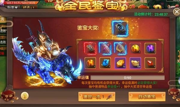 活動說明:活動期間,可以花費50元寶進行鑒寶,鑒寶一次增加一點幸運值,幸運值越高中獎幾率越高,幸運值滿必開大獎。大獎:珍貴坐騎-天水玄獸